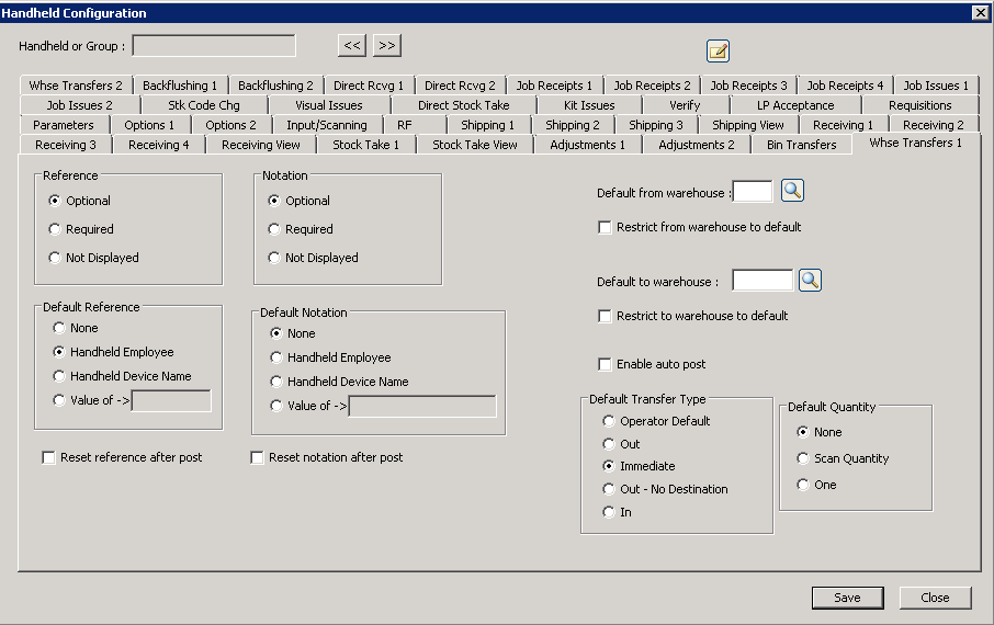 For each transaction type (adjustment, receiving, job issue, etc.), the following options tell the handheld whether it should ask for the reference or notation, and secondarily whether a default value should be used.