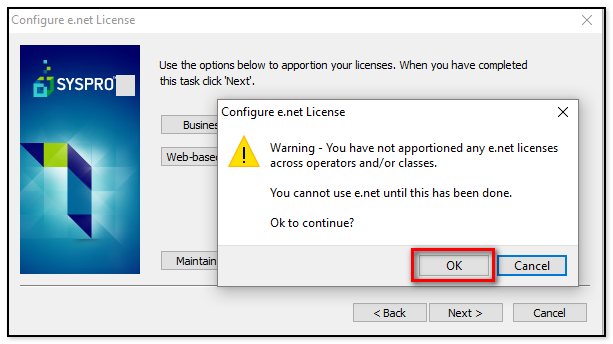 Click Next on the "Configure e.net Licenses" prompt, as there is no need to apportion e.net licenses across operators and/or classes. Click Next and Finish. SYSPRO exits and requires logging-in again.