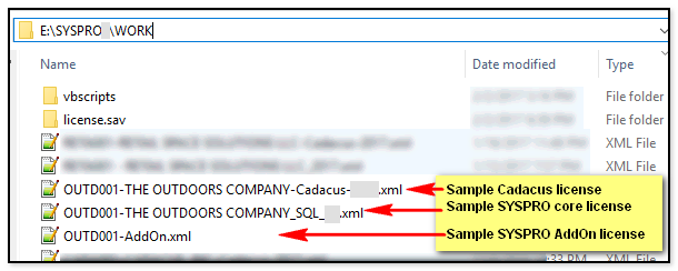 Below are sample license files. The SYSPRO WORK directory is the SYSPRO default (but not required) location for license files. Note the AddOn license is not needed for licensing the Handheld WMS solution.