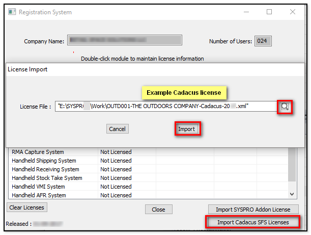 In the Registration System window, select "Import Cadacus SFS Licenses". Browse to/select the Cadacus license (the XML file containing the word "Cadacus" somewhere in the name), and click "Import". Click Next and Close. The Registration window should now show "Licensed".