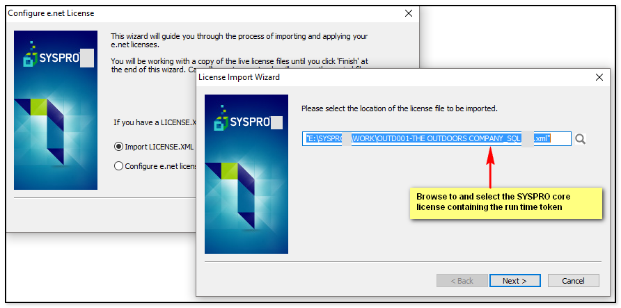 Select "Import LICENSE.XML" and click Next. Browse to/select the SYSPRO core license containing the run time token, click Next as shown in the below example: