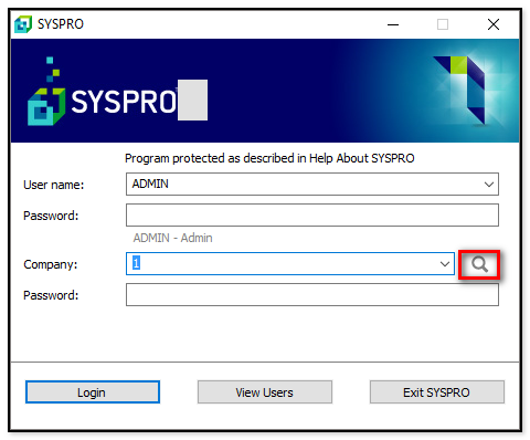 Launch SYSPRO, login with administrative privileges, select the lookup icon, choose the company, and select "Change":