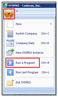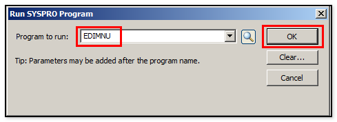 Launch SYSPRO, choose the main SYSPRO menu, select "Run a Program", then enter "EDIMNU" at the prompt: