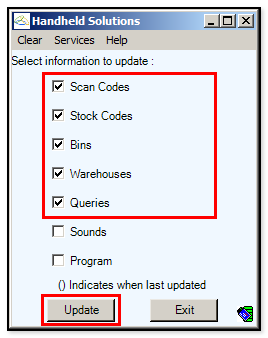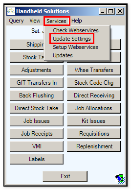 Launch the Handheld WMS on Windows application from the Windows Start menu and select: Services > Update Settings